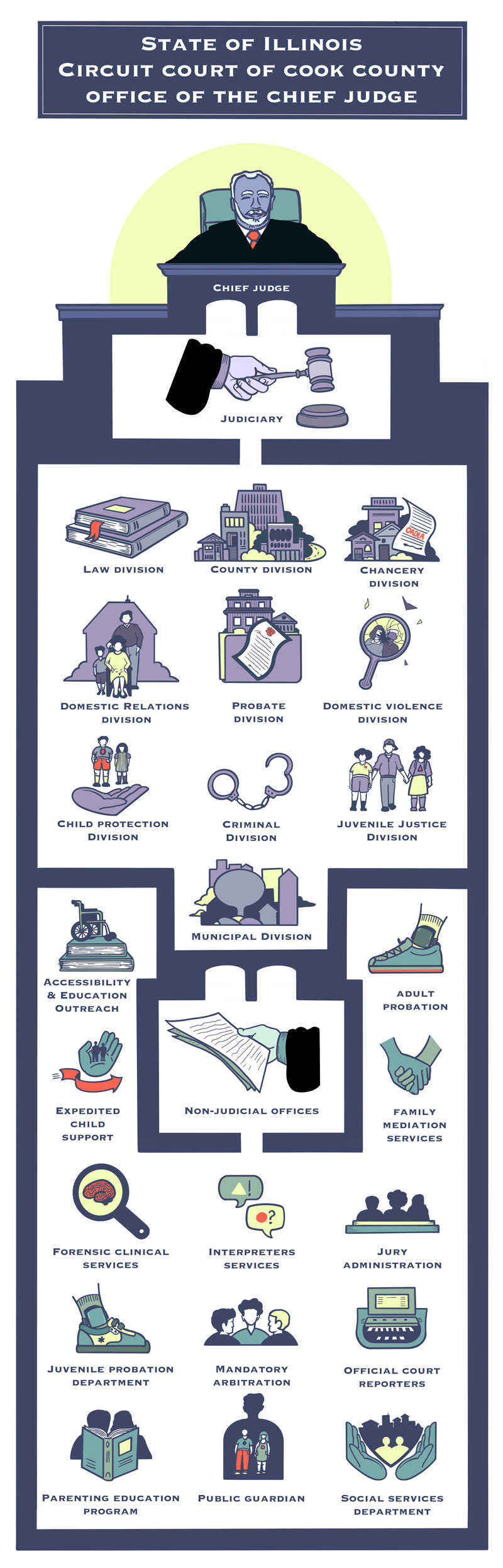 Evans’ political acumen allowed him to endure as chief judge for 24 years and to enact significant progressive change in the inherently conservative courts, often for the benefit of the most vulnerable people to come through the system. His actions often seemed to come under duress, and his inaction was often criticized. But he achieved longevity in this role by keeping enough judges happy, absorbing public pressure, and weathering scandals unperturbed. His deliberative and self-assured leadership style was also well suited to the peculiar nature of the circuit court, an institution whose opaqueness is baked into law, whose principal actors are themselves elected officials, and whose bureaucracy is an entrenched extension of Chicago’s old political machine.