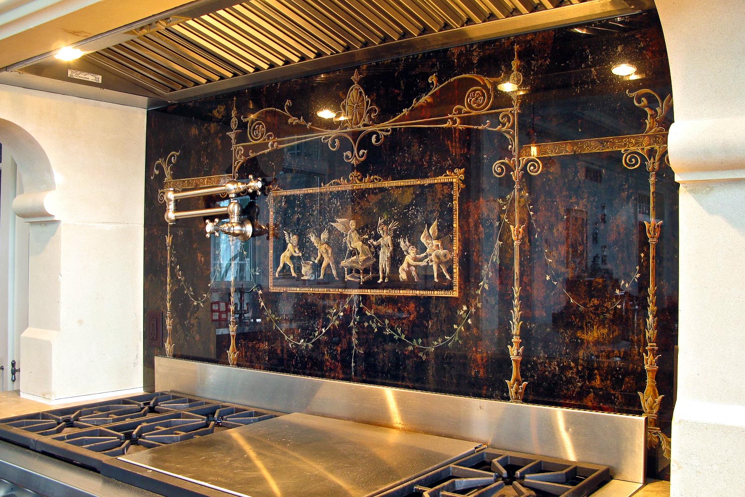 Want to make a big statement to your art-loving mom this Mother’s Day? One Chicago chef (and expectant mother) was recently surprised with a new backsplash in the form of an églomisé installation. This decorative art technique involves gilding and painting the back side of glass so the design shows through to the front—in this case, creating an ornate, Italian-inspired scene.