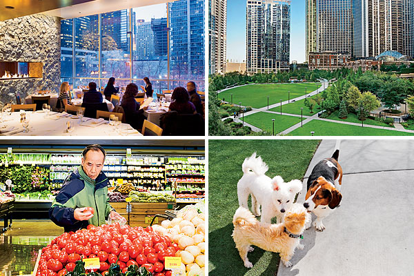 Clockwise from top left: III Forks; an aerial shot of Lakeshore East Park; dogs greeting each other at Lakeshore East Park; a customer at Mariano’s Fresh Market. For more photos, launch the gallery »
