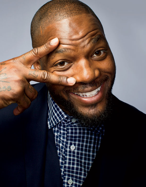 By the time Bennett’s masseur comes to loosen up that enormous body of his two hours later, the theme park of his brain has really opened up. Roller coasters of conversation zoom, twist, and double back with insane 100-foot drops. Topics covered: childhood mischief (“I was banned from IHOP. Not all IHOPs, just the one on Highway 6 by my house where I grew up. I stole a lot of pancakes”); reading (“I only read the left-hand pages, so I finish books twice as fast”); the difference between New York and Los Angeles (“They’re pretty similar except the people in New York are actually doing shit with their lives”); dinosaurs (“They’re awesome. I think we can all agree on that”); Indianapolis Colts quarterback Andrew Luck (“People make fun of me for having a BlackBerry. He still has a flip phone”); and NFL players in general (“So many of them are assholes. Whenever someone tells me, ‘Oh, so-and-so is my favorite player,’ I think, Man, your favorite player’s an asshole”).