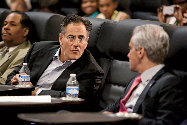Then there’s Sacks’s involvement with the stopgap state budget that brought the mayor a PR win in June—not because it solved malignant problems but simply because Chicago public schools will open in September. Axelrod credits Sacks with “shuttle diplomacy” in talks between Chicago and Springfield with John Cullerton, Mike Madigan, and Bruce Rauner. “He played a major diplomatic role,” Axelrod says. “He has cache with Rauner and could be blunt.” (Sacks and his wife, Cari, are friends of the Rauners, and Cari serves on the board of Diana Rauner’s Ounce of Prevention Fund.)