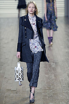 So what did he get right? It felt a bit like the old Chloe girl, with chiffon dresses and sexy coats. The boxy coat over the chiffon dress could be a trend. There were some cute Liberty prints, pretty off-the-shoulder looks, and dresses with trailing hemlines that accentuated the speedy walk of the girls. The shoes were fantastic. Heeled ankle boots in bright colors and pumps that looked like boots with leaves at the ankle. If the weapon-like footwear at Balenciaga, Chloe, and Lanvin is any indication, the pointy shoe is making a comeback.
