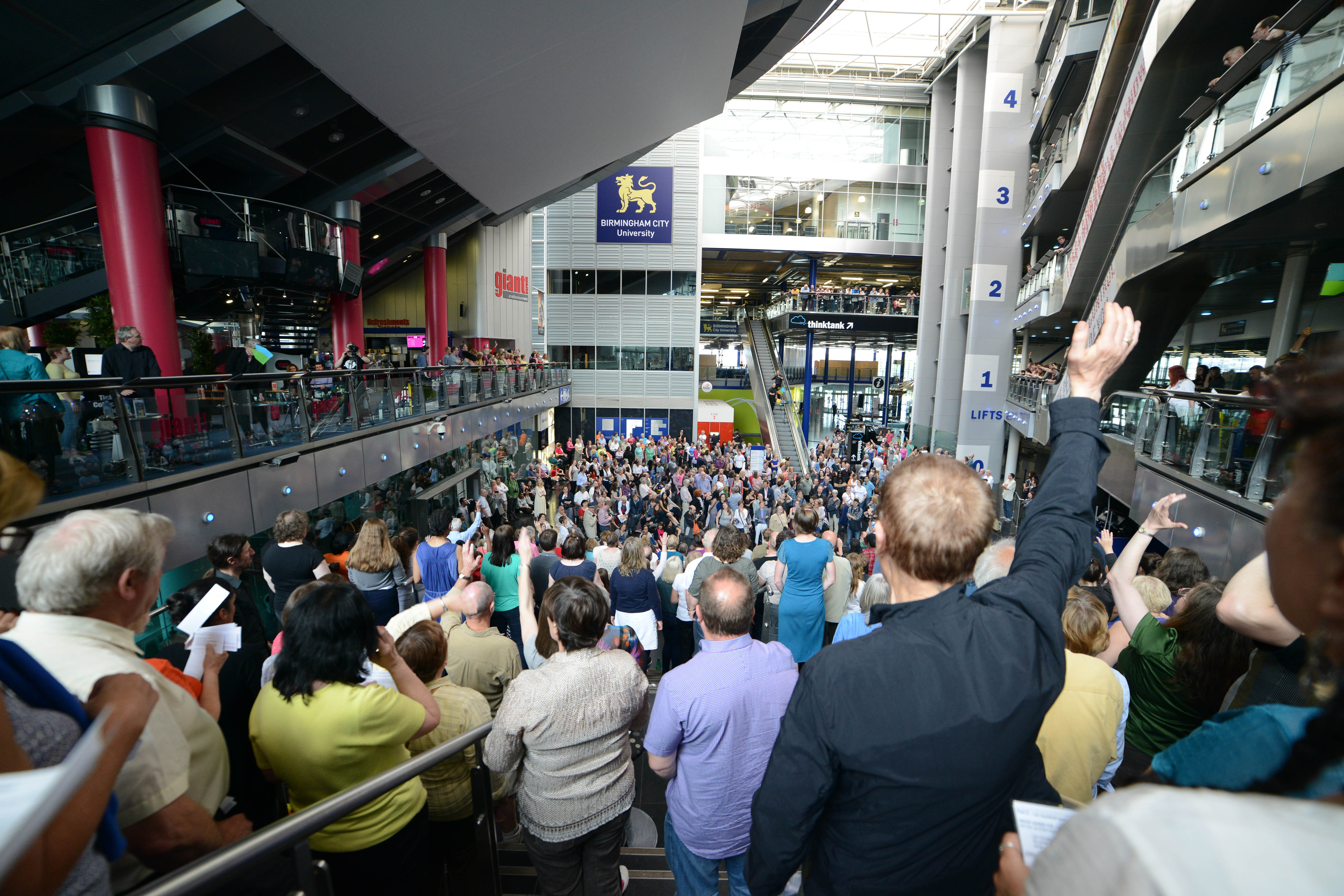 Nally will stand on a platform toward the middle of the plaza, where most people will be able to see him, aided by assistants carrying giant, color-coded cue cards. He’s also depending on individual choral leaders, who'll guide their groups along, or lead call-and-response sections of the piece.