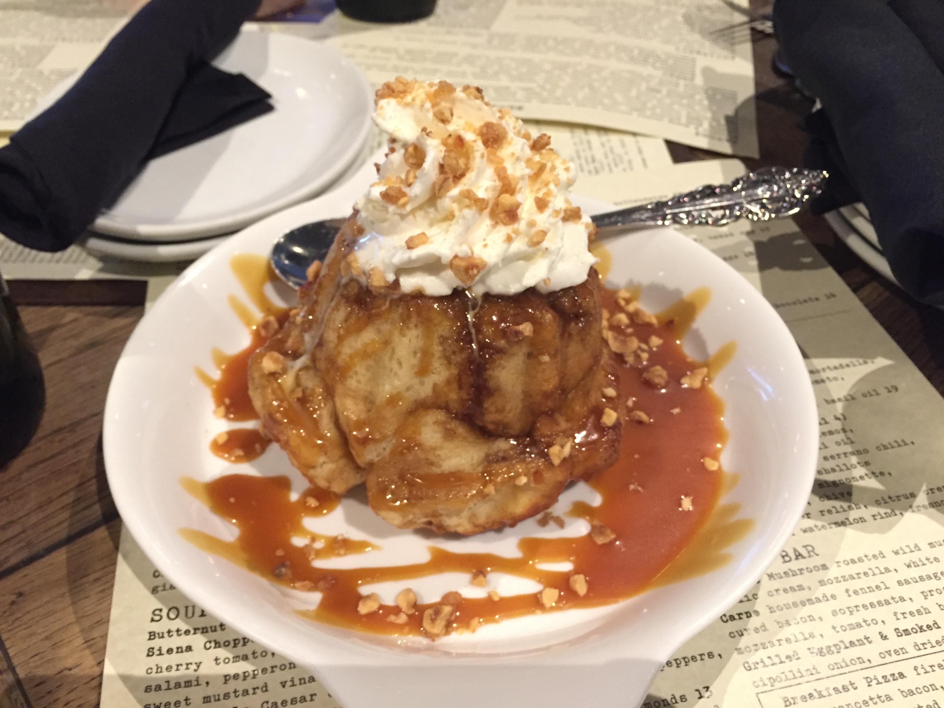 Our server directed us to monkey bread ($14) as a shareable prelude to the meal. Who were we to argue with ordering a glorified cinnamon roll: soft, warm, bathed in caramel and hazelnut cream sauce, and finished with whipped cream and candied hazelnuts? (We may or may not have ordered a second.)