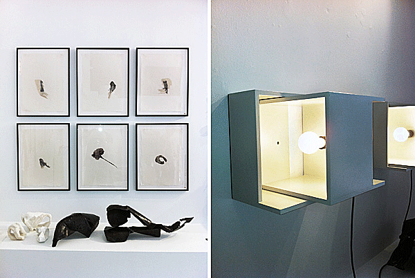 The other night associate art director Adam Moroschan and I dropped by Pavilion, one of the best-curated home boutiques in town, where owners Deborah Colman and Neil Strauss threw a little party to celebrate the expansion of their offerings by international artists. We were particularly taken by The Haiku Drawings, collages by artist Katherine Kavanaugh, an artist and faculty member at the Maryland Institute College of Art. From a series called “The Privacy of Water,” they are printed with archival ink on rice paper and mounted on Okawara Japanese paper, part of a limited series (framed, 21” x 16”). The architectural lights by Clemens Tissi can be moved and adjusted to create different dramatic effects. See a video demonstrating them here.