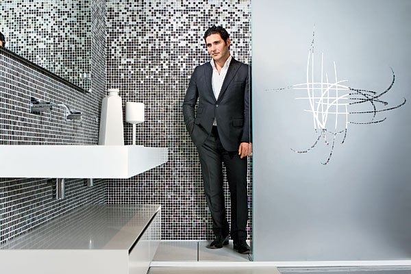 Lanzetta stands in an Antonio Lupi shower with a frosted glass wall that cheekily depicts a finger drawing on a steamy surface (designs are customizable). The Lupi showroom opened in April.
