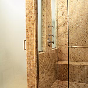 | Fisher and her husband have two young children, a boy and girl, whose bedrooms are more sophisticated than childish. Like the rest of the rooms upstairs, theirs are painted in Benjamin Moore’s Old Salem Gray (a uniform color saved them money on paint) and pepped up with wallpapered accent walls. Shown here, in daughter Parker’s room, Retro Squares wallpaper from Urban Source. | Fisher’s husband had always wanted a "bathroom that made him feel like he was at a luxury hotel," and that’s exactly what he got. The honey onyx tile is a splurge from Tile Gallery, as were the Roburn recessed medicine cabinets ("you just can’t get those unique, narrow-and-tall proportions off the shelf," she explains) and a custom glass shower enclosure. The one thing that was surprisingly inexpensive, despite its indulgent appearance, is a TV hidden behind a two-way "police" mirror that Fisher had custom-cut at LaSalle Glass-it’s mounted on the opposite side of the wall from inside the master bedroom closet. |