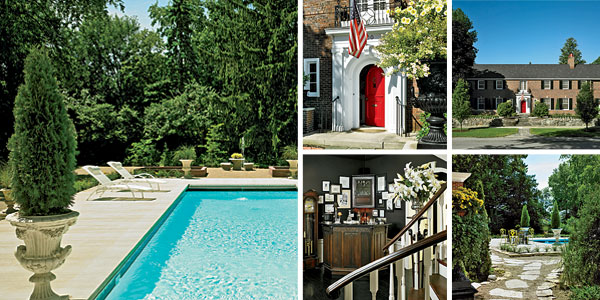 Far left The Heisters replaced a kidney-shaped pool in the backyard with a rectangular one. Clockwise from left An oversized urn, painted black, makes a bold statement near the front door. The façade of the Georgian-style house, built in 1923, is invitingly unostentatious. To ensure easy maintenance in the backyard, the lawn was replaced with pebbles and flagstones; long-established evergreens contribute to privacy while recently added plants, including hydrangeas, roses, and boxwood, create a lush retreat. An assortment of artwork (including framed Dorothy Parker quotes, hand-lettered and illustrated by Mark) hangs behind a bar in the grand foyer.