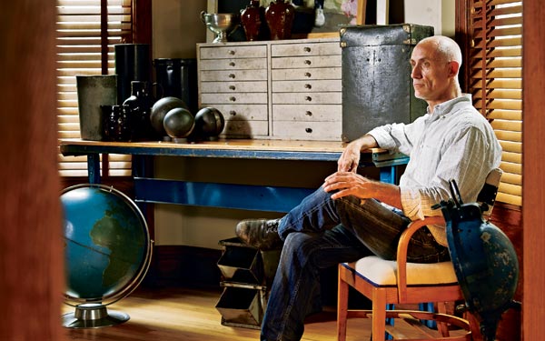 The owner: Larry Vodak, the shopkeeper (as he likes to put it) at Scout, an antique shop at 5221 N. Clark St. The digs: A two-bedroom apartment on the second floor of a vintage brick two-flat, a few blocks away from Scout. He lives here with his son, Will, who is currently at college in Ohio.The aesthetic: Like his shop, it feels like a cozy and unpretentious urban cottage, with plenty of nicked-up wood furniture and flea-market treasures, and some industrial pieces mixed in. "There’s something about cottage elements that suspend the need to be perfect," he says. "Although this is my first home, I treat it like my second home. I don’t obsess over how it looks; I care how I feel in it and I care how others feel in it." Big ideas: If you’ve spent any time in Scout, you know that Vodak loves large pieces—and he’s not afraid to fill his small apartment with them. Two glass-doored metal cabinets filled with oversize vases and other vessels (and, as if this were not enough, topped with a large basket and a pile of suitcases) take up one wall in his dining room. He bought the cabinets, once a dirty mustard color (he had them painted gray, a staple—along with black—in the Vodak color palette), at Brownstone Antiques, right across the street from his shop. "For months and months they were there, and no one noticed them because they were filled with junk," says Vodak, who stops by Brownstone daily. "Then one day I looked at them and said, "These are incredible! Let’s take them out! Let’s paint them!’" Also in the dining room, Vodak breaks up the calming sea of gray, black, and wood with old cobalt blue chairs from a General Motors assembly plant waiting room and an industrial table with a base painted the same color (the latter made by his friend Michelle Peterson-Albandoz, the owner of Las Manos Gallery, also across the street—Vodak is big on supporting his neighbors).