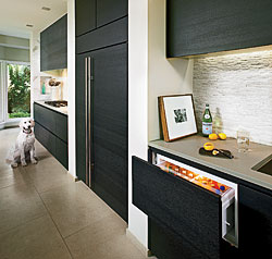 Refrigerated drawers keep drinks within arm’s reach of thirsty teens at the kitchen table.
