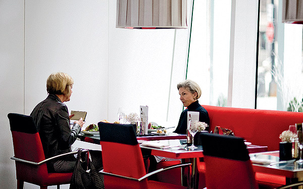 The amuse—a bracing shot of hot potato-leek vichyssoise with nuggets of lobster—was my first hint that Café des Architectes had slammed the door on its past. The restaurant’s new confidence enables it to do light appetizers such as gossamer slices of hamachi carpaccio seasoned with satsuma tangerine segments and orange vinaigrette, paired with mellow artichoke purée. The bravado also extends to hearty starters including the braised short ribs in a heady star anise reduction with braised baby carrots, carrot sauce, and crisp carrot strips. Noguier is on fire here, coaxing every ounce of flavor out of a mushroom velouté poured tableside over a luxurious disk of black truffle gêlée that emits a beguiling aroma as it melts into the soup.