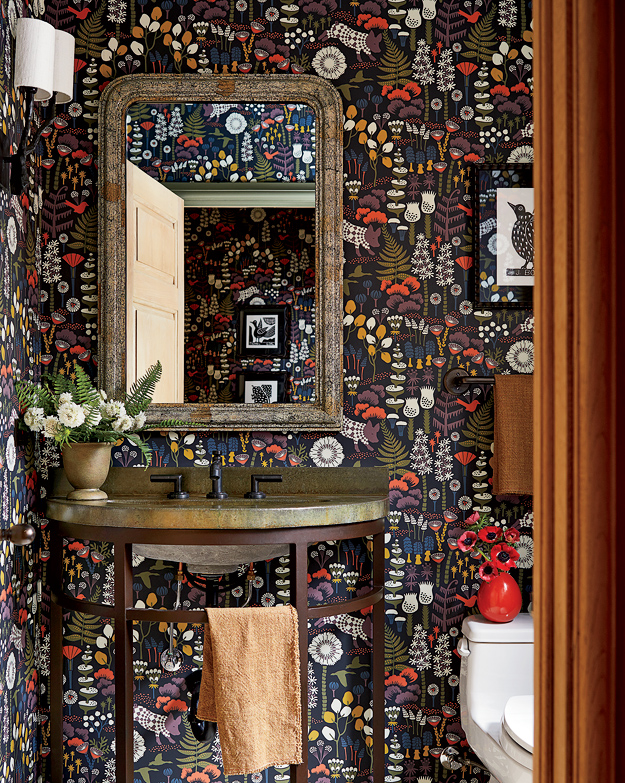 There’s plenty of space for whimsy in the seven-bedroom, 10-bath home, especially upstairs. Strategically placed sofas, chairs, and rugs pop in pink, teal, green, and orange. One powder room is lined with Boråstapeter wallpaper of pigs in sweaters, and the chandelier hanging above the stairwell is a powder-coated steel mise en scène of water lilies. The cheery children’s rooms appear very lived in, and the playroom features a mirrored wall for the kids to doodle on and an enormous table salvaged from the renovation.