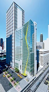 Sitting on a tight lot at State and Lake streets, the hotel features a compact, eccentric layout with three restaurants, 298 slick guest rooms, and a lobby that defies gravity.