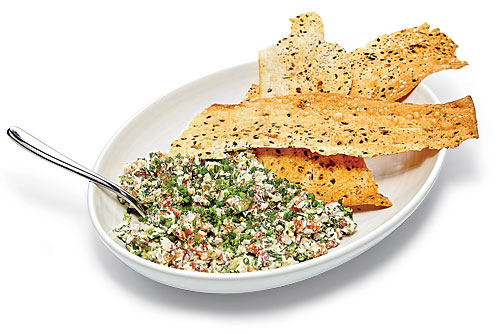 A fine dice mixed with kicky condiments and ready to spread on housemade crisps