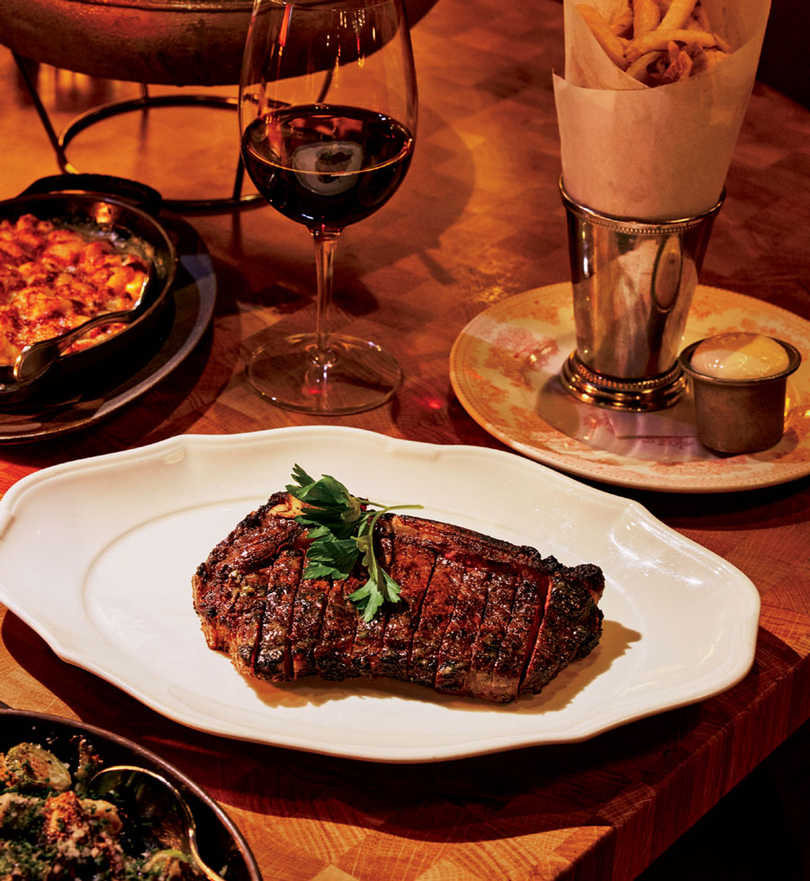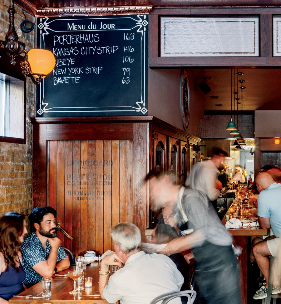 Bavette’s reminds you in every detail that a steakhouse is about so much more than steak. Here, Hogsalt has perfected its low-lumen aesthetic of goth fantasia meets English tavern. Slip into a tufted leather booth amid a profusion of lampshades seeping golden light, and once your eyes adjust, you’ll note all that awaits — from the iced shellfish display at one end of the room to the golden-hued bar on the other. It’s all a bit off script, which is this restaurant’s signature charm. Maybe you want an offbeat steak, like a bone-in filet mignon, or perhaps you’re feeling the lobster frites. There’s an entire menu of old-fashioned variations, a terrifically deep wine list, and a cadre of servers who seem to glide through the dining room on wheels. If you can’t secure a reservation (still hard after 13 years), go early to snag seats at the bar. That’s almost more fun. — J.K.