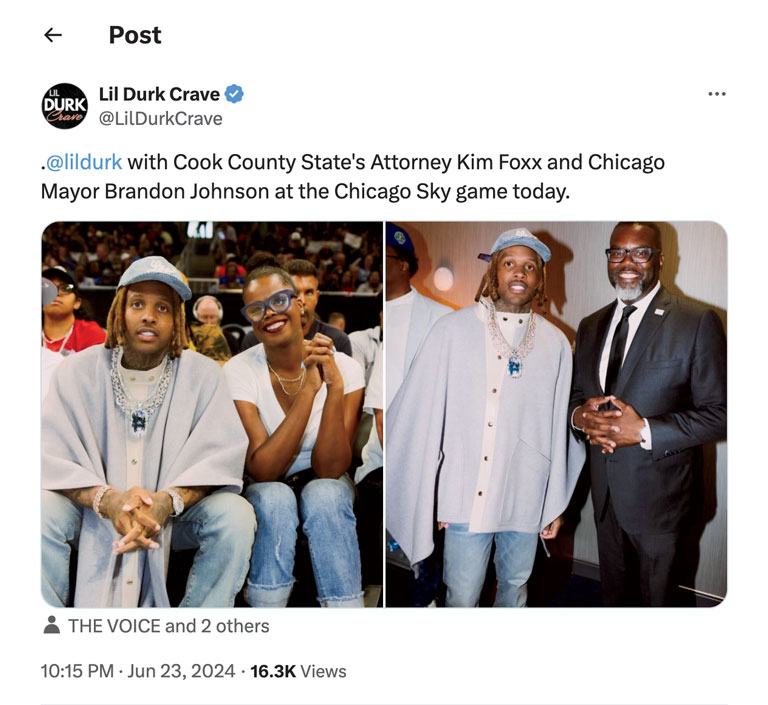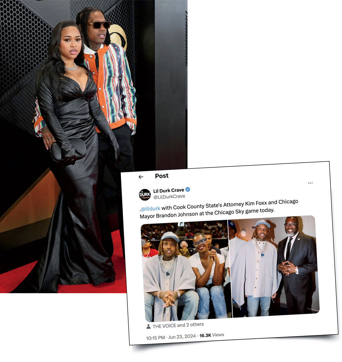 He also increased his charitable efforts and community engagement. His Neighborhood Heroes Foundation handed out thousands of Thanksgiving turkey dinners in the Chicago area. In 2023, the foundation and its partners awarded $50,000 scholarships to two Chicago students for tuition at Howard University. By that year, records show, contributions to the charity would reach nearly $714,000. The same year, Durk donated $150,000 to Brandon Johnson’s mayoral campaign, making the rapper one of Johnson’s largest contributors, apart from labor unions. He sat courtside at a Chicago Sky game, next to Kim Foxx, the Cook County state’s attorney at the time.