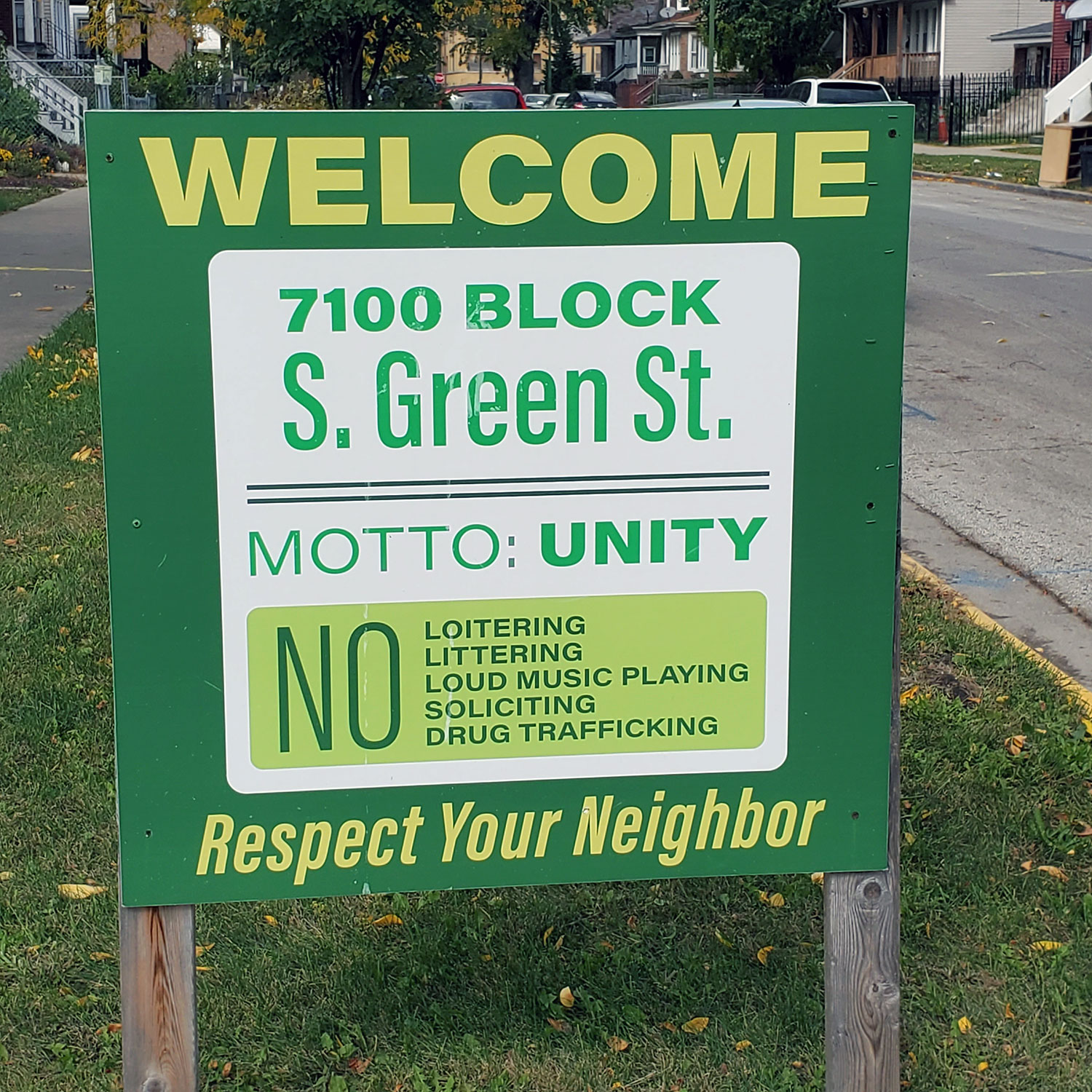 Most of the older signs bear those admonitions. But there is a new tradition of block club signs. Jahmal Cole, a Chatham resident who founded My Block, My Hood, My City, has worked with the Design Apprenticeship Program at the University of Chicago Arts Incubator to encourage young people to paint more colorful, more positive, more welcoming signs — signs whose messages are not preceded by the word “NO.” On a recent trip through Greater Grand Crossing, Avalon Park, Chatham and Auburn-Gresham, we saw both signs that warned and signs that welcomed. Swipe through the gallery below to see a few examples.
