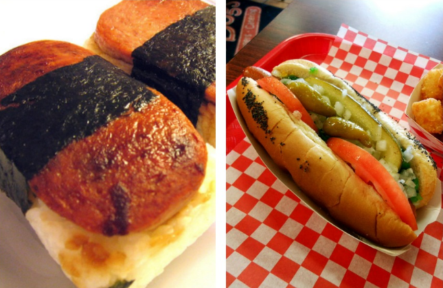 Presentation makes a big difference. If not for the can vs. sausage casing format, the Chicago-style dog and Spam might well be cousins. They were both born in the 1930s. Though the hot dog itself was first introduced at Chicago's 1893 Columbian Exposition, Vienna Beef says the classic Chicago dog was a favorite Depression-era food. Hot dog vendors sold the “salad on top” hot dogs from their carts for a nickel a piece. Spam followed in 1937 and became another low-cost staple in pantries across the country.