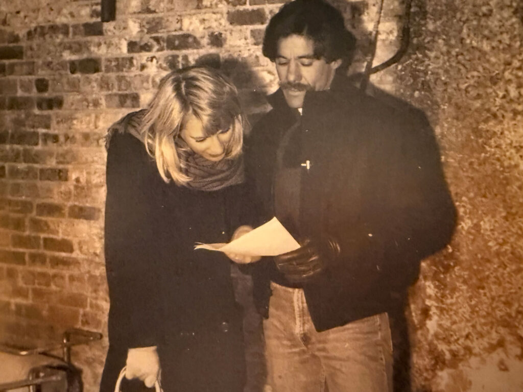 Joanie Bayhack consults with Geraldo Rivera during the filming of the show. Photograph courtesy of Bayhack
