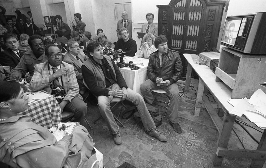 Members of the media watch the live broadcast of the show at the Lexington on April 21, 1986. Photograh by Walter Kale/Chicago Tribune