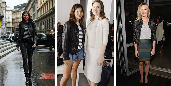 From left: Emmanuelle Alt of Paris Vogue and Julia Restoin-Roitfeld, daughter of Paris Vogue editor in chief, rock the striped-shirt-with-leather-jacket combo. Kirsten Dunst wears a leather jacket with a Proenza Schouler skirt.