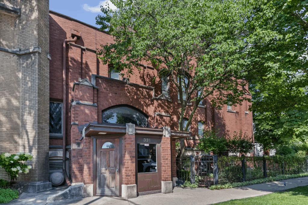 Located in a vintage 1880s apartment building in Chicago’s Old Town, this two-bedroom, two-bathroom unit has an open-concept layout spanning 1,300 square feet, with exposed brick walls, a wood-burning fireplace, and numerous updates. From the condo’s large bay window, there is a view of the elevated train tracks right across the street. The Sedgwick CTA station is less than 500 feet from the building’s entrance. In addition to in-unit laundry and deeded garage parking, the property offers a shared back deck and reasonable monthly HOAs of $357.