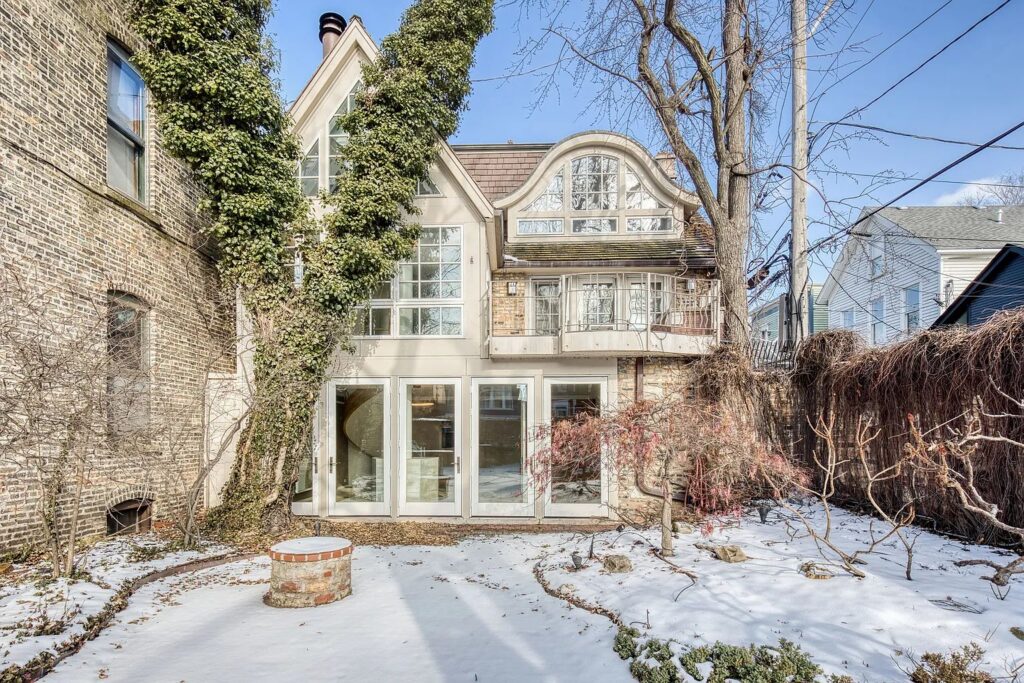 Fern Court is a narrow, alley-like street spanning two mere blocks in the Old Town Triangle. On a corner lot, behind a brick wall setback at the rear of the property, stands this two-bedroom home described in its real estate listing as a “1920s cottage.” According to the Old Town Historic District building catalog, this house was originally built in 1901 for J.A. Licht, with a third floor addition built around 2000. In addition to its postmodern interior, I definitely noticed great details, such as the numerous skylights, interesting staircase, and a painting that covers the television screen. Thanks to its garden wall, you have a private oasis away from the city, featuring a fish pond, a fireplace, and an outdoor kitchen.