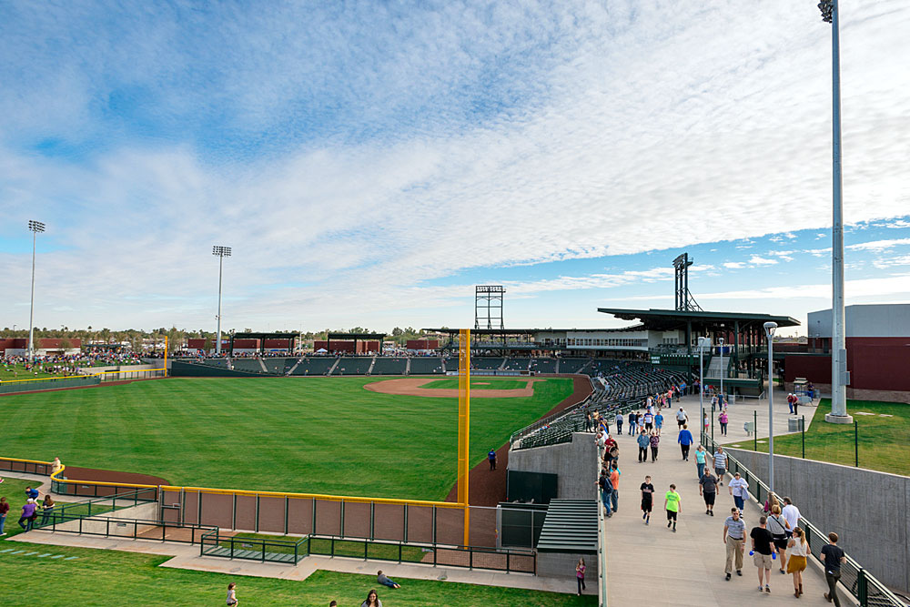 The $99 million complex spans 140 acres across a former golf course and includes seven side practice fields and some 5,000 parking spaces. There’s also an 88-foot tall video board, luxury suites, two party decks, a pathway from the clubhouse to the field for close-up views of the players, and, nods to Wrigley Field, such as a left field Budweiser deck with rooftop seating. A smattering of local food trucks will line up during the games just beyond the center field wall, and, nearby, visitors can also have fun at the new Mesa Riverview Park, an awesome city park with a 300-foot rock climbing wall, 75-foot-zip line, and 50-foot rope climbing tower.